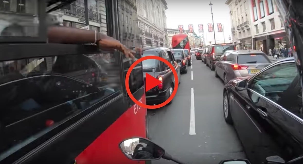En medio de esta típica escena de congestión vehicular, aparece Royal Jordanian, un youtuber londinense que sube videos de sus aventuras en las calles de su ciudad, montado en su Honda Grom. En un momento mientras va manejando a un velocidad moderada, su cámara capta a él mismo meterse en medio de unos coches para adelantarse al tráfico; como cualquier motociclista lo haría, al hacerlo, un conductor de un autobús hace algo inesperado que le salvaría de arremeter contra un peatón que cruzaba la avenida inadvertidamente.